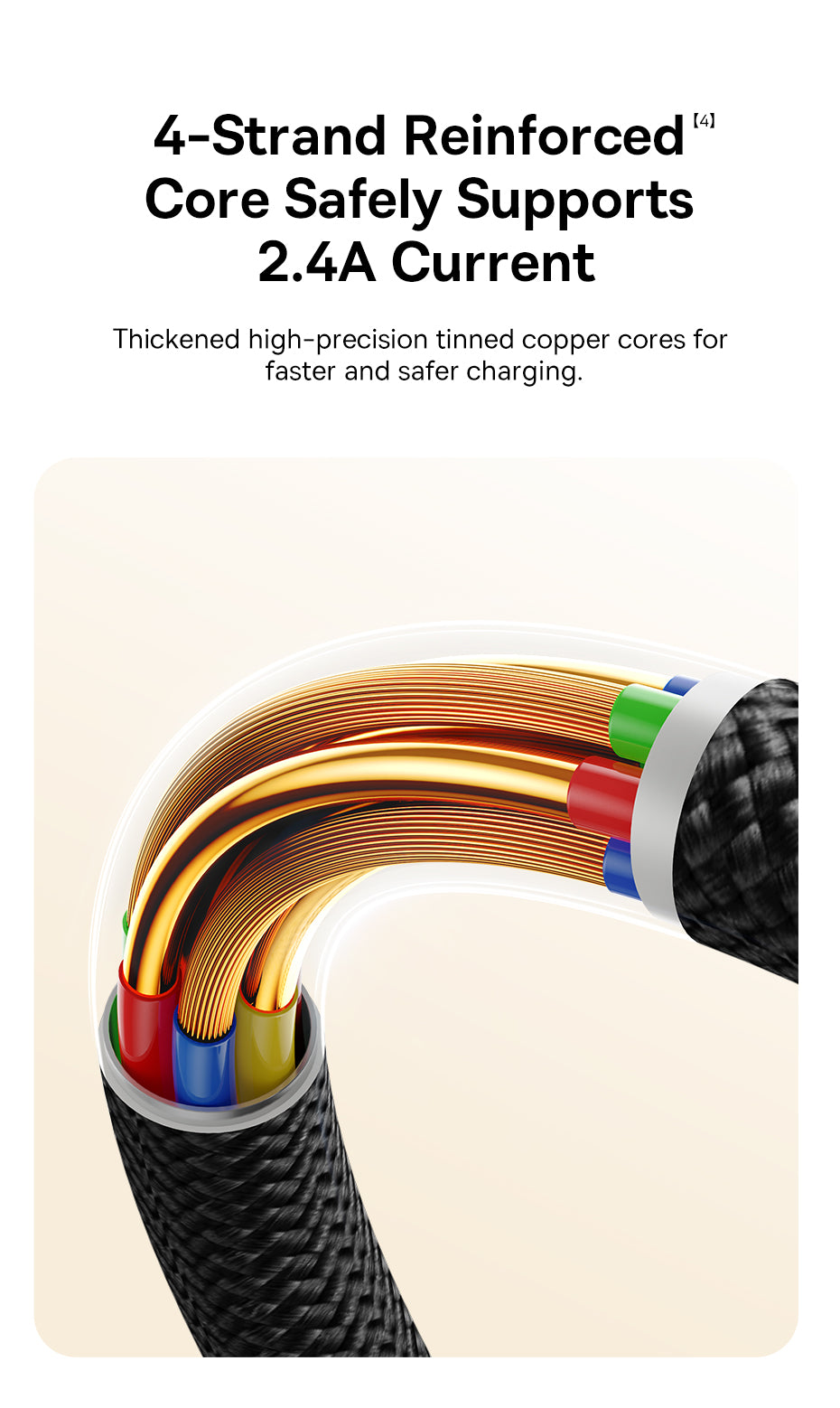 Kabel Baseus Dura USB/Lightning je navržen pro maximální efektivitu a dlouhou životnost. Přívodní proud až 2,4 A zajišťuje rychlé a stabilní nabíjení pro všechna zařízení s Lightning konektorem. Nylonový opletený kabel zvyšuje odolnost proti opotřebení a roztržení. Inteligentní rychlé nabíjení umožňuje nabíjení při nízkých teplotách a chrání zařízení před přehřátím. Délka 1 m je ideální pro pohodlné používání v různých situacích a pro každodenní nabíjení. Kabel prošel více než 10 000 ohybu, což potvrzuje jeho odolnost i při intenzivním používání. Zesílené jádro se čtyřmi vlákny zajišťuje stabilní a bezpečné nabíjení i při připojení více zařízení současně. Materiály zahrnují hliníkovou slitinu a nylon pro pevnost a odolnost.