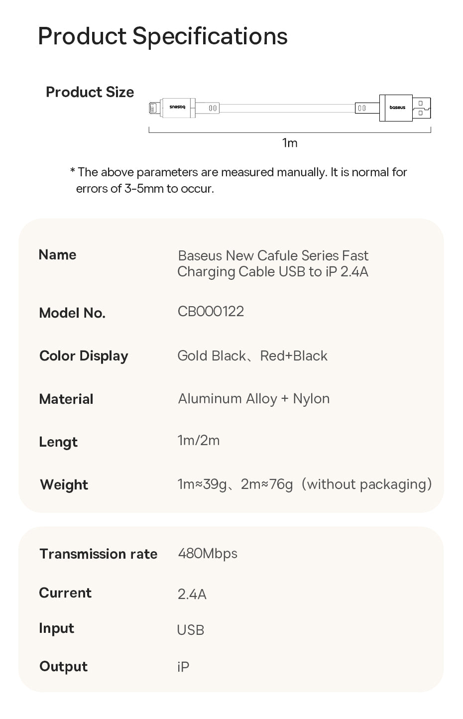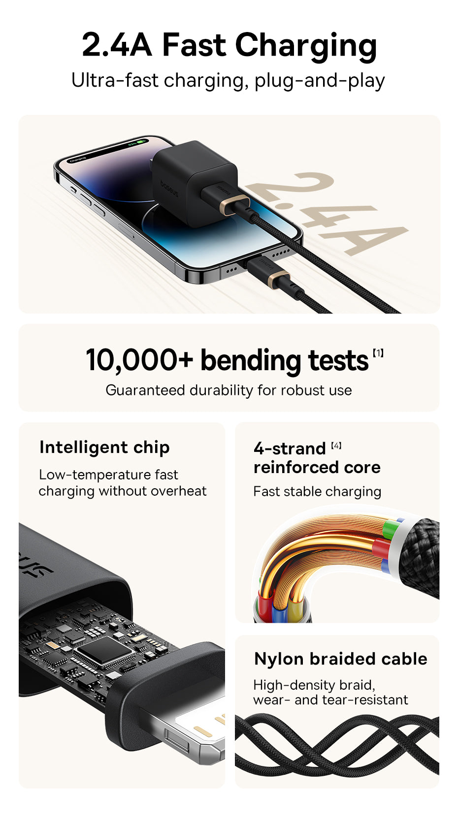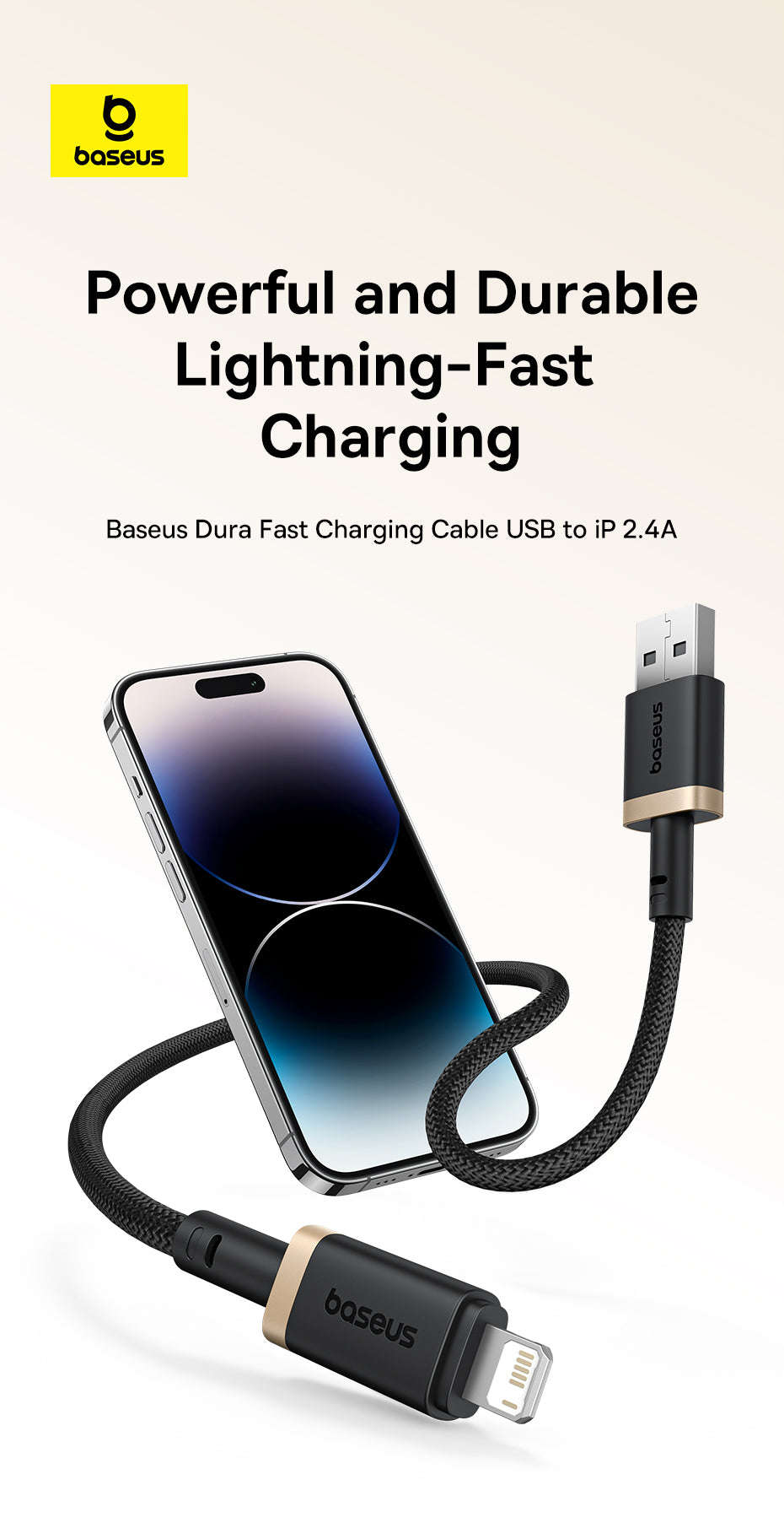 Kabel Baseus Dura USB/Lightning je spolehlivé řešení pro rychlé nabíjení a každodenní používání. Proud až 2,4 A umožňuje efektivní nabíjení mobilních zařízení bez zbytečných prodlev. Nylonový opletený povrch zajišťuje vysokou odolnost proti poškození a snižuje riziko poškození při častém ohýbání. Kabel je navržen pro více než 10 000 ohybů a integruje inteligentní čip, který reguluje teplotu a navíc přehřívání. Délka 2 metry poskytuje větší volnost pohybu doma, v kanceláři i na cestách.