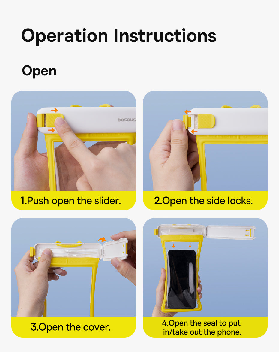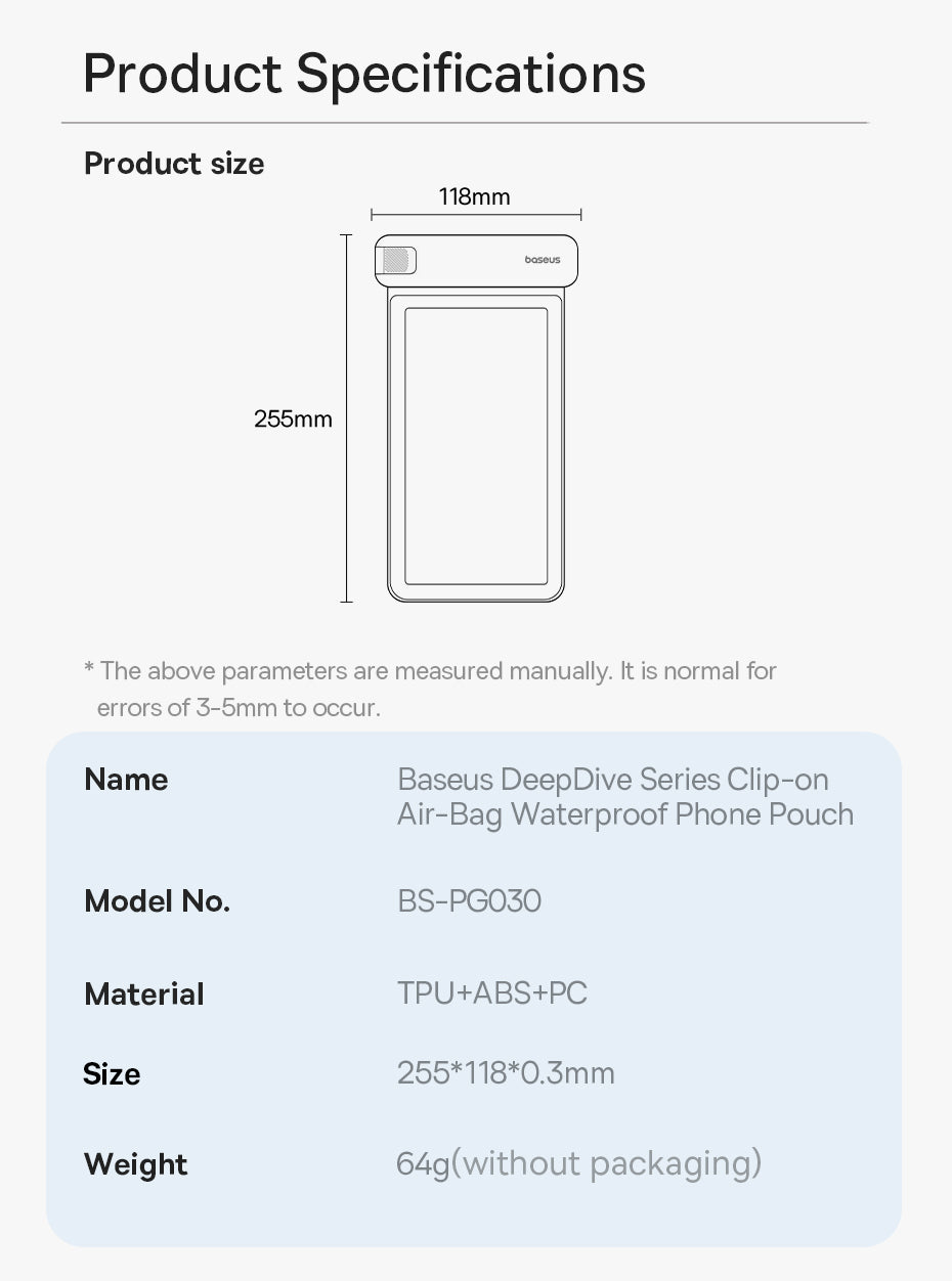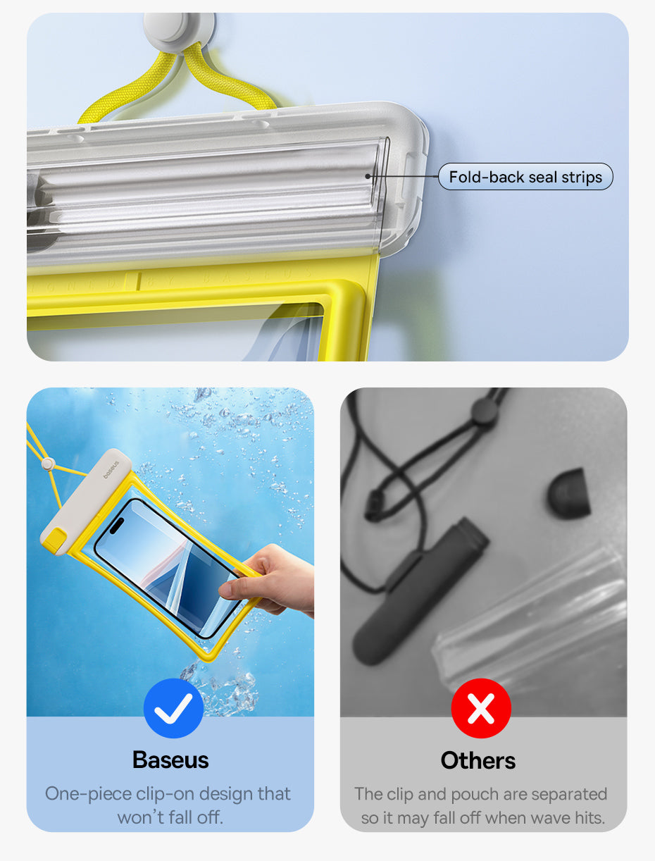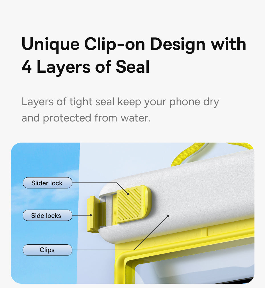 Voděodolné pouzdro Baseus DeepDive poskytuje spolehlivou ochranu pro smartphone při vodních sportech iv náročných podmínkách. Nabízí plnou ochranu proti vodě a pádům a umožňuje používat telefon bez vyjmutí z pouzdra, takže můžete pořizovat atmosférické fotografie i pod vodou. Pouzdro má zavírací mechanismus s jezdcem a čtyřvrstvé těsnění pro úroveň IPX8. Proti pádu slouží vzduchové polštářky na přední i zadní straně a součástí je šňůrka z materiálů šetrných k pokožce. TPU materiál zajišťuje zachování citlivosti dotykové obrazovky a neovlivňuje kvalitu fotografií, takže ovládání telefonu zůstává jisté i při ponoření.