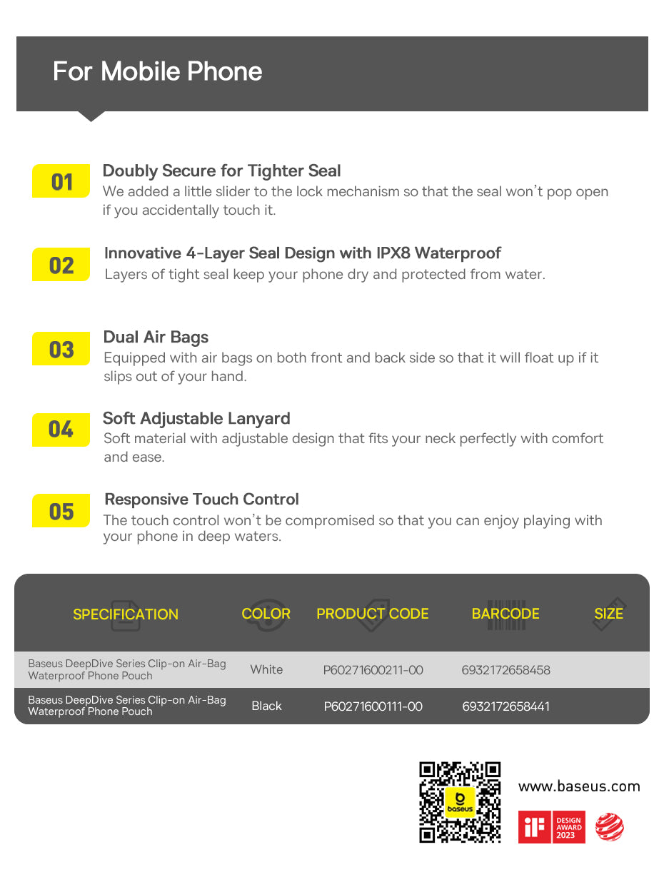 Baseus DeepDive je voděodolné pouzdro pro milovníky vodních sportů, které poskytuje kompletní ochranu proti vodě a pádu a umožňuje plné ovládání telefonu, aniž byste ho vyndávali.