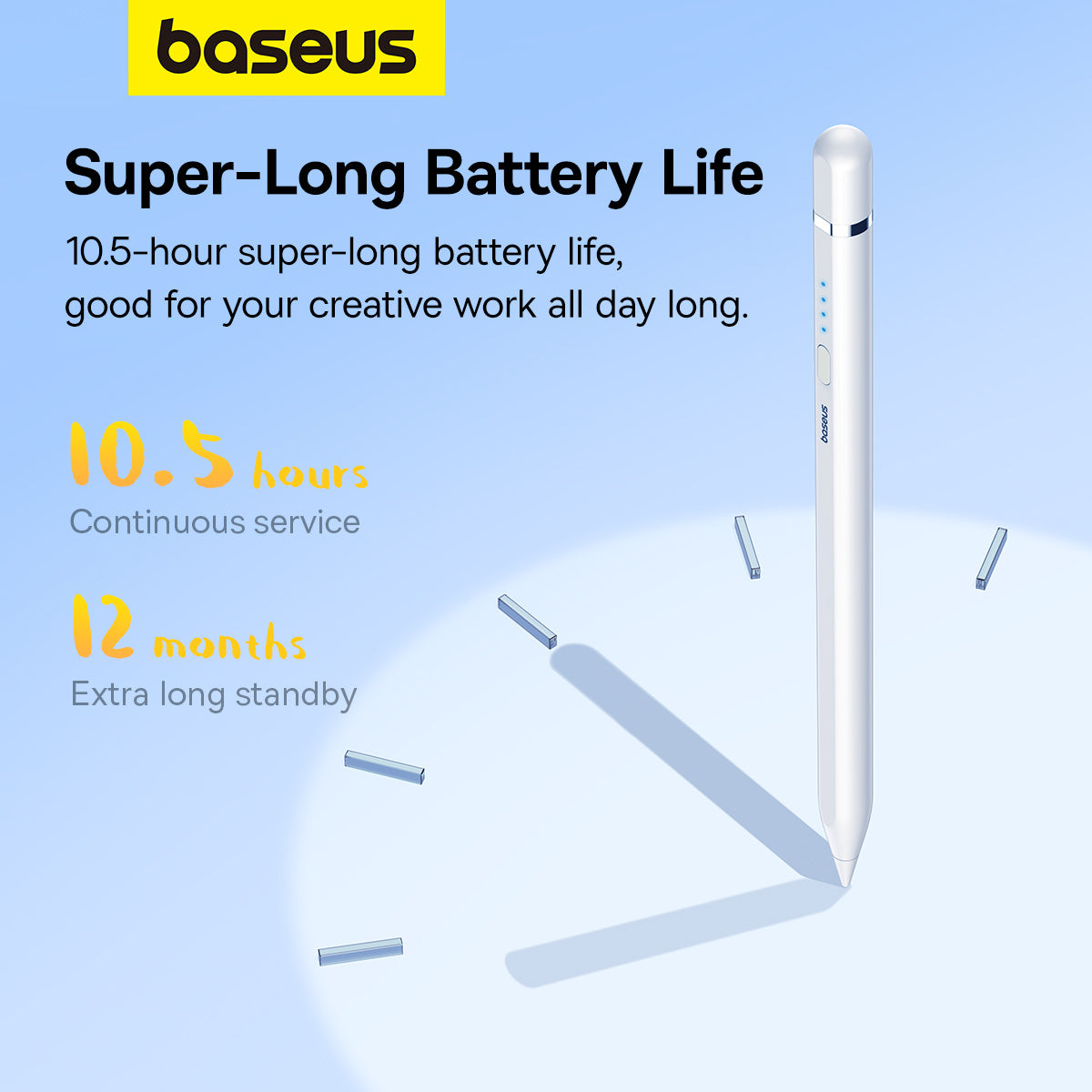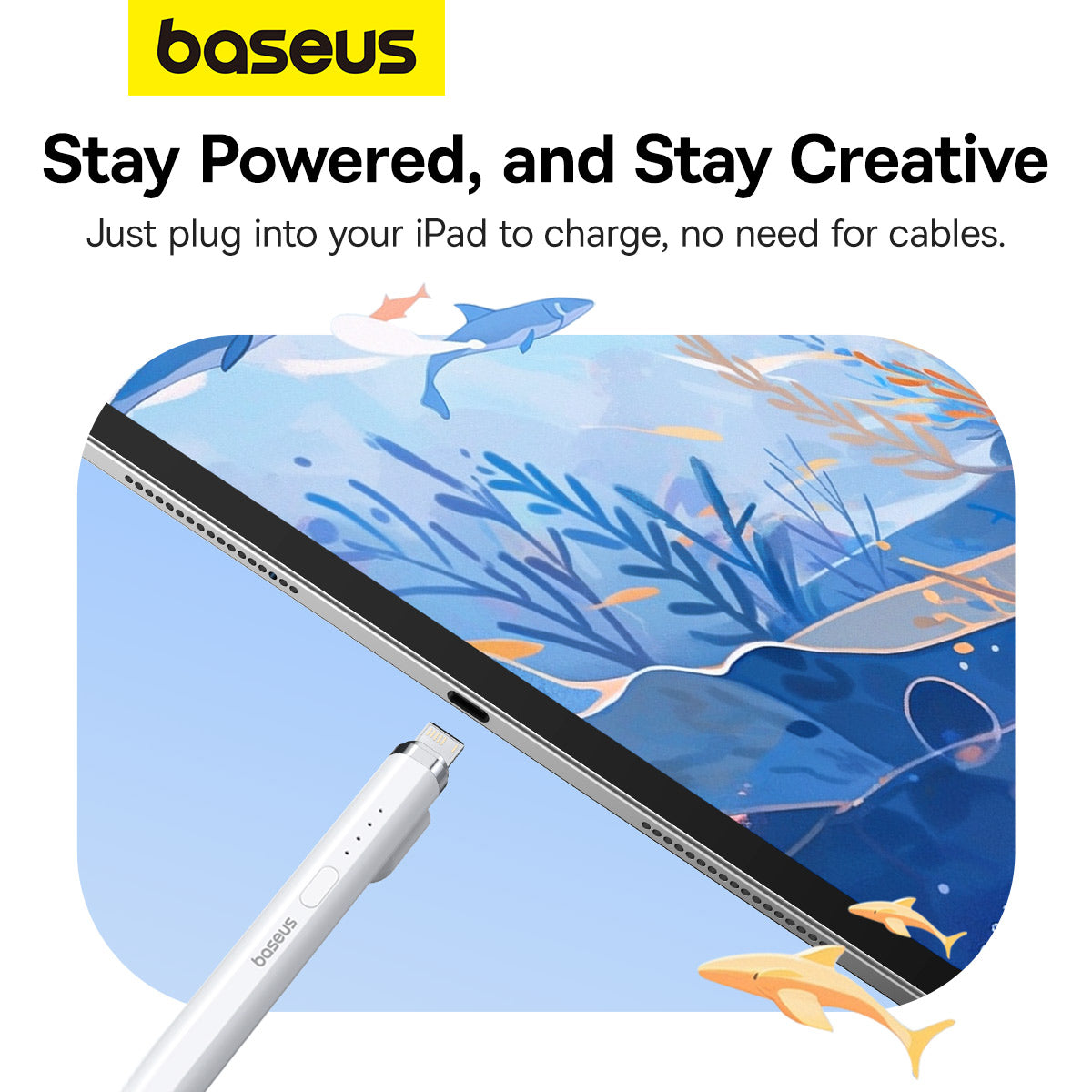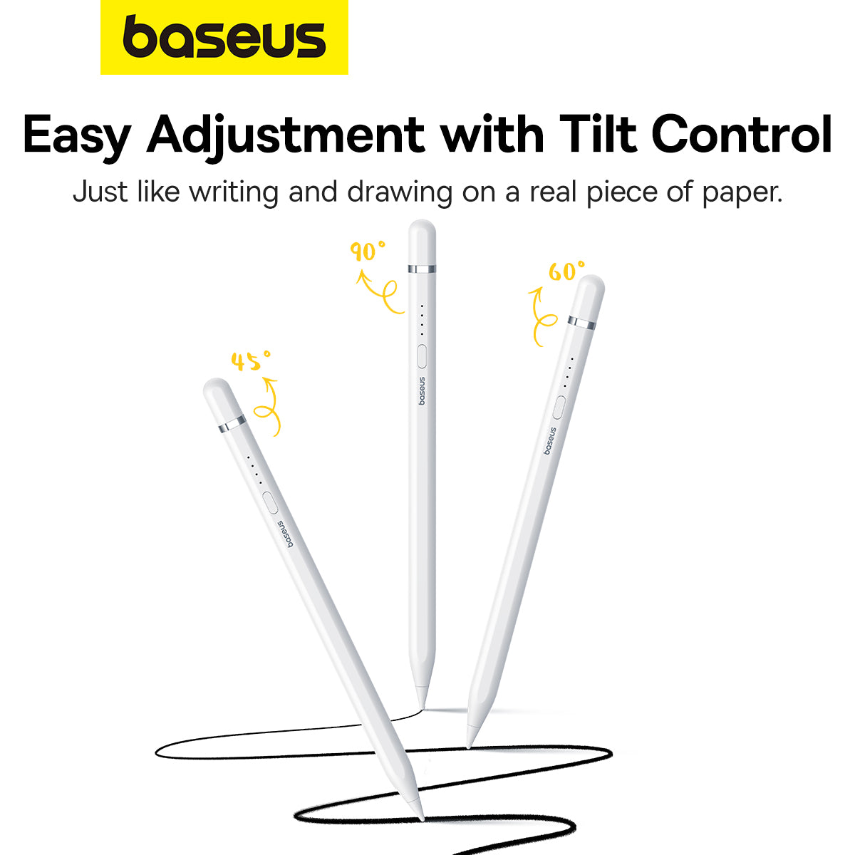 Baseus Stylus Smooth Writing Series je praktický nástroj pro grafiku, kancelářské pracovníky, studenty a další. Umožňuje pohodlné psaní i kreslení na tabletu a tloušťku čáry lze nastavit naklápěním stylusu. Optimální úhly: 90° pro největší přesnost, 60° pro psaní, 45° pro silné tahy a vybarvování. Palm Rejection umožňuje klidné položení ruky na obrazovku bez rušení kresby. Stylus má vestavěná tlačítka a 14 funkcí pro rychlou obsluhu tabletu, včetně záznamu snímků a ovládání hlasitosti. Baterie vydrží až 10,5 hodiny provozu av pohotovosti kolem 12 měsíců; nabíjení lze provádět přímo z iPadu a stav baterie lze sledovat LED indikátory nebo na obrazovce. Hrot z POM, pozlacené měděné jádro a magnetické provedení zajišťující spolehlivost a snadné přichycení na iPad. V balení je stylus, náhradní hrot a USB-A na Lightning kabel.
