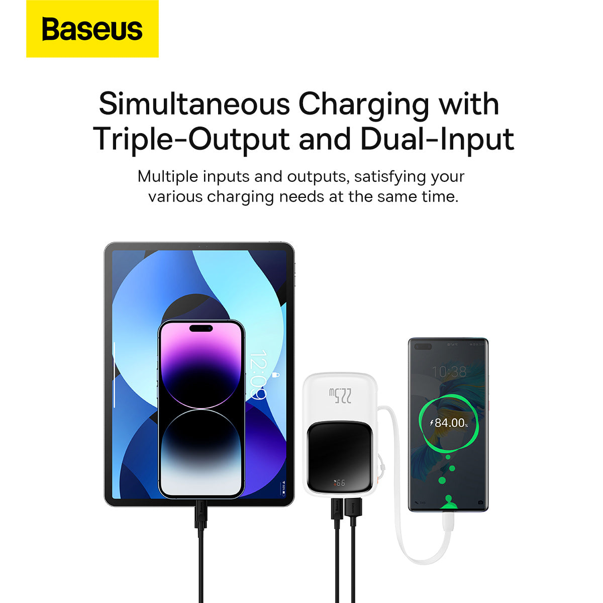 Baseus Qpow Pro je objemná powerbanka s vestavěným USB-C kabelem a dvěma výstupními porty. Umožňuje nabíjet až tři zařízení současně a kabel USB-C poskytuje až 22,5 W; další výstupy USB a USB-C nabízí rychlé nabíjení různých zařízení.
