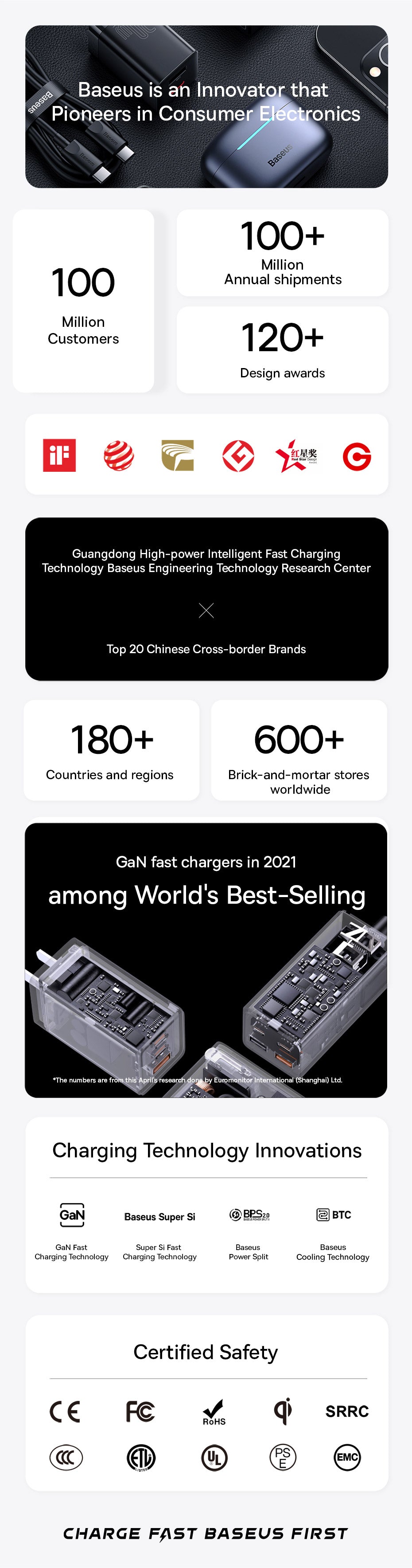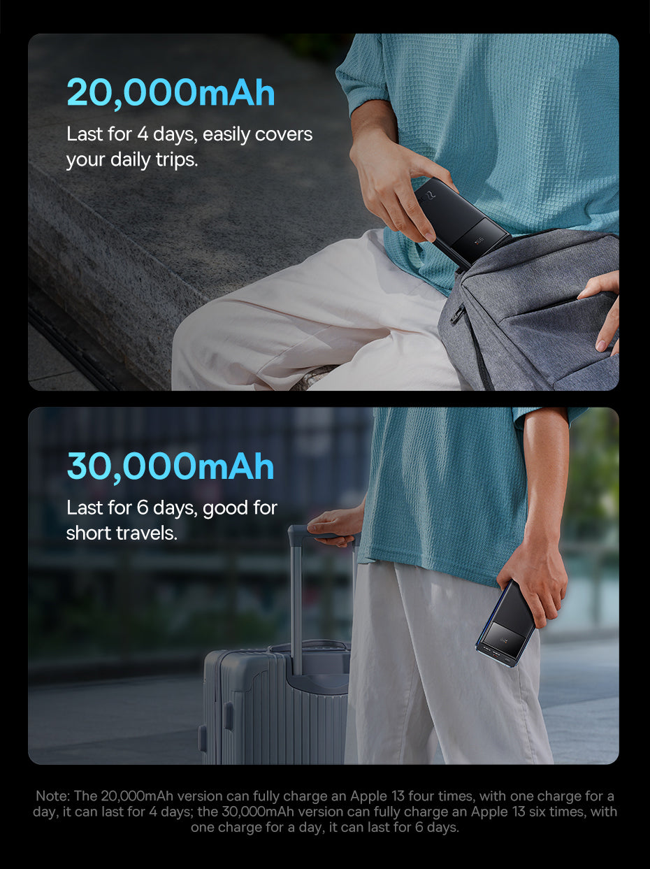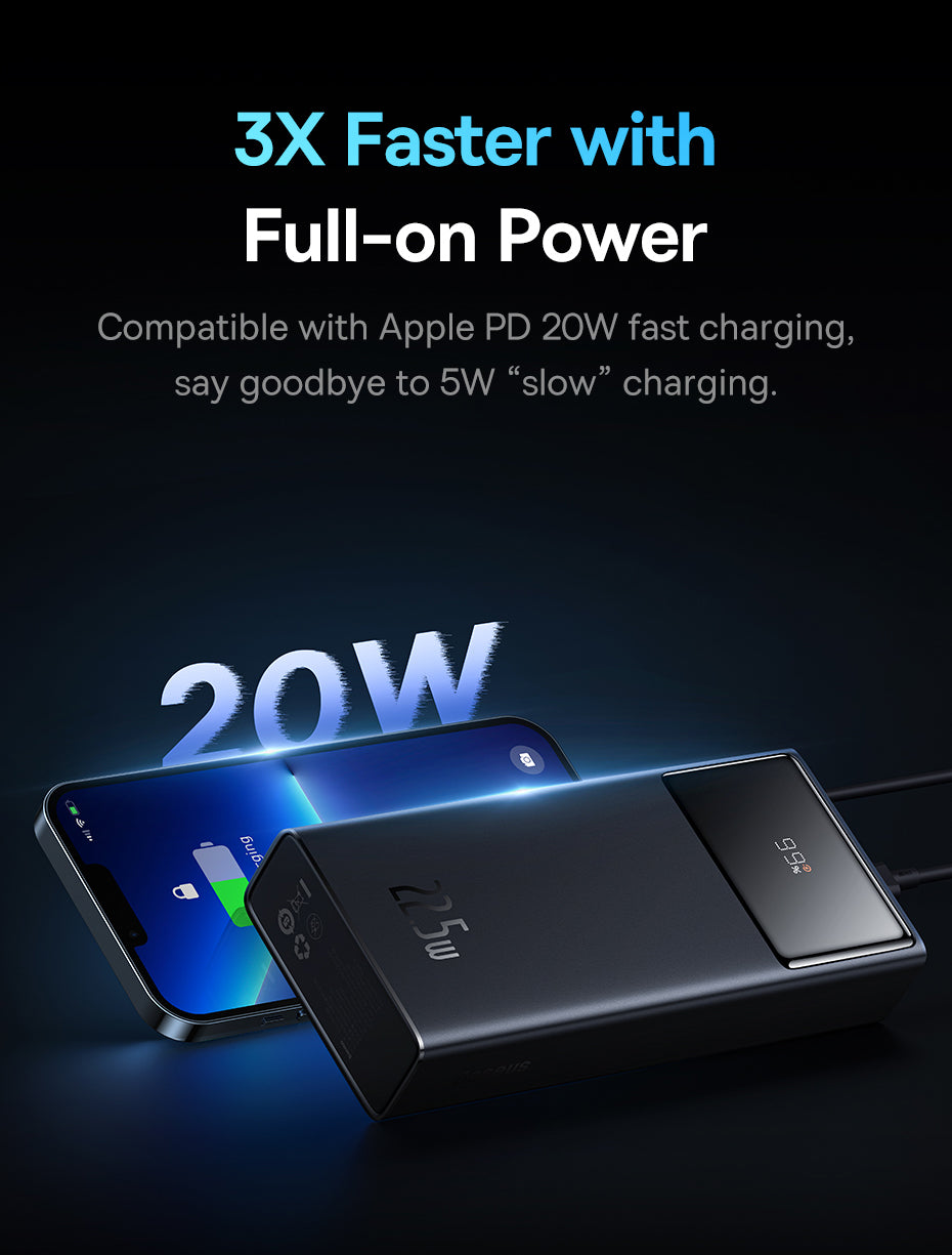 Podporuje rychlé nabíjení a inteligentní BPSII, která dynamicky rozděluje mezi připojená zařízení a upravuje výkon i energii. Kompatibilní s Huawei SCP/FCP, Apple PD, Xiaomi QC a Samsung AFC. Porty: Micro vstup, Type-C vstup, Type-C výstup, USB1/USB2. PD 20 W pro Apple 12/13 dosáhnete 50 % za 30 minut; Apple 13 lze nabít až čtyřikrát. Doba plného nabití powerbanky je 6–7 hodin. Zabezpečení zahrnuje teplotní senzor NTC a víceúrovňovou ochranu proti přebíjení, přepětí, nadproudu, zkratu a elektromagnetickému poli. LED displej zobrazuje zostávajúce. V balení: powerbanka a USB kabel. Je vhodné i pro cestování letadlem.