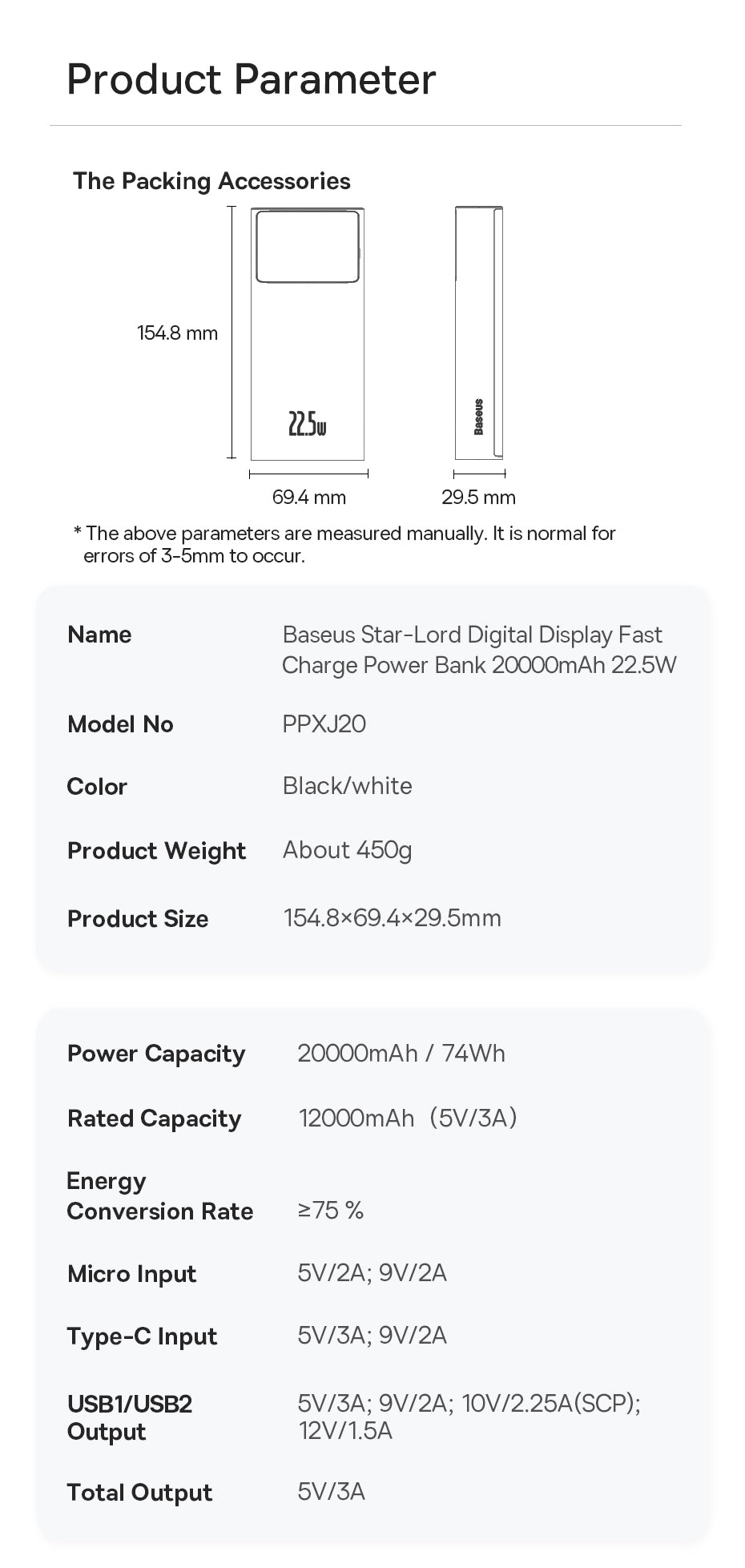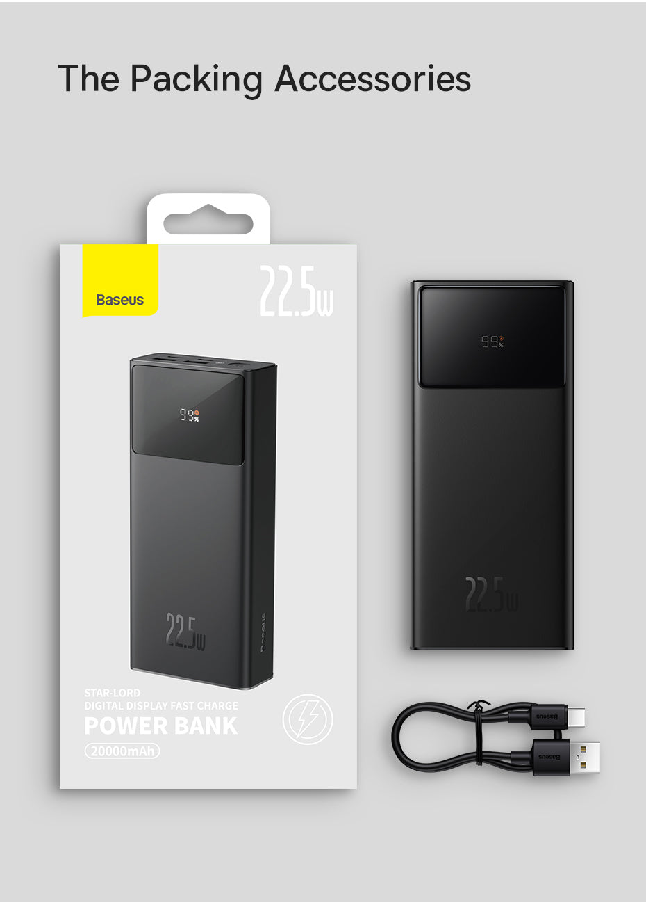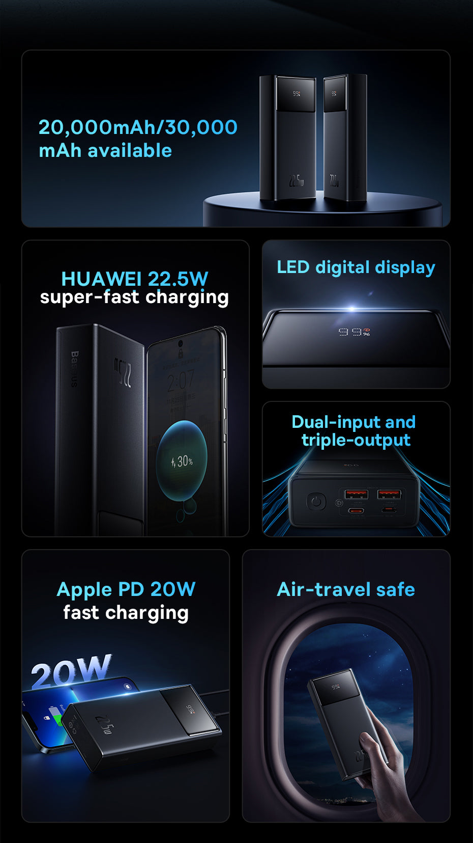 Nabíjejte až 3 zařízení najednou pomocí powerbanky Baseus Star-Lord. S výkonem 22,5 W a kapacitou 20000 mAh poskytuje rychlé a bezpečné nabíjení na cestách. Podporuje rychlé nabíjení a inteligentní rozdělování energie (BPSII), které dynamicky rozděluje výkon mezi zařízení a upravuje napětí. Umožňuje nabíjet současně 3 zařízení a je kompatibilní s Huawei SCP/FCP, Apple PD, Xiaomi QC a Samsung AFC. Disponuje porty Micro (vstup), Type-C (vstup), Type-C (výstup) a USB USB1/USB2. Digitální LED displej zobrazuje zbývající kapacitu. Mezinárodní schválení pro leteckou přepravu. V balení: powerbanka a USB kabel. Rozměry 154,8 × 69,4 × 29,5 mm, hmotnost 450 g. Doba nabíjení samotné powerbanky je 6–7 hodin. PD 20W pro Apple 12/13 dosáhnete 50 % za 30 minut; pro iPhone 13 lze nabít čtyřikrát, což dle specifikací stačí na několik dní bez nabíjení.