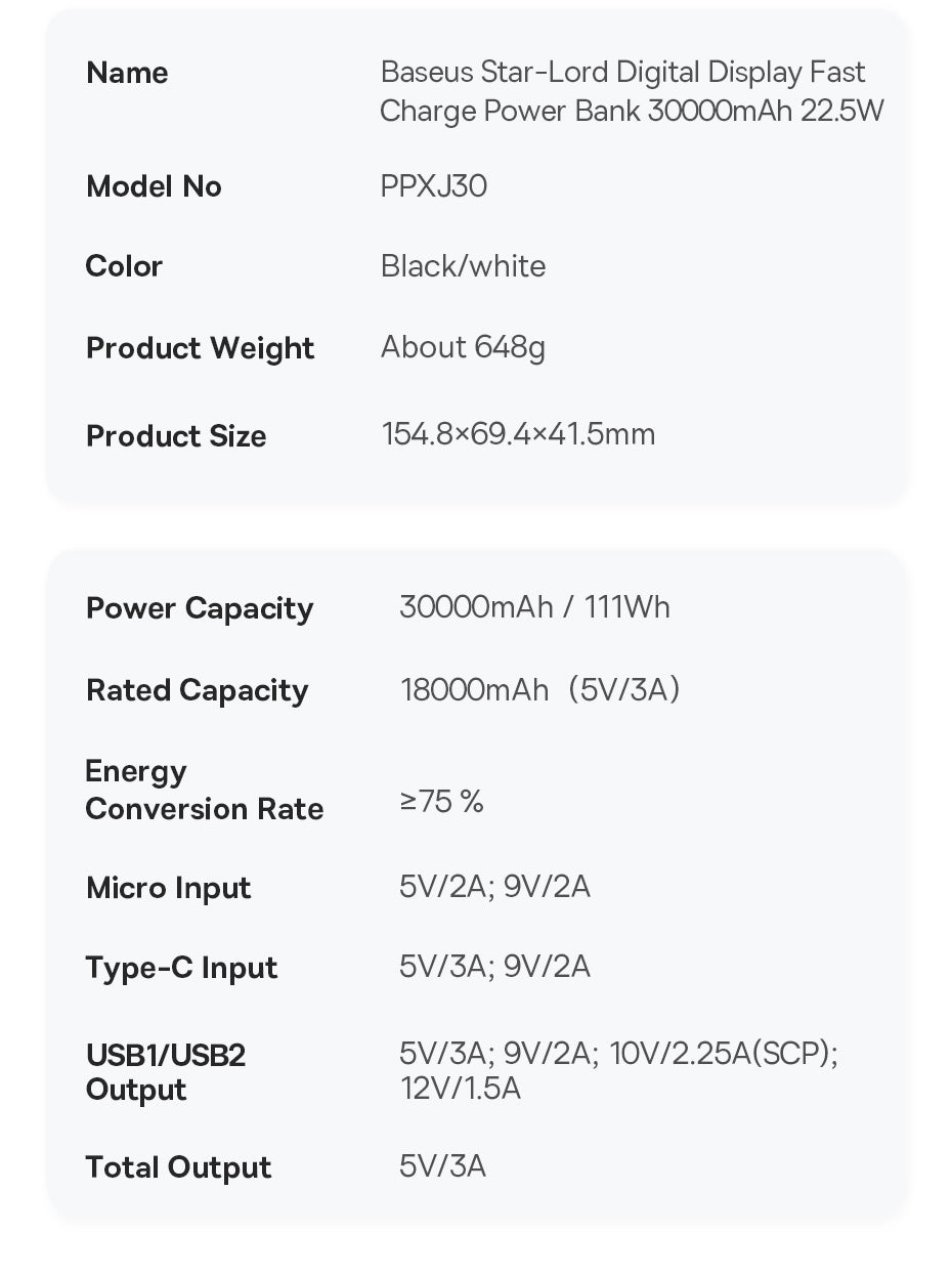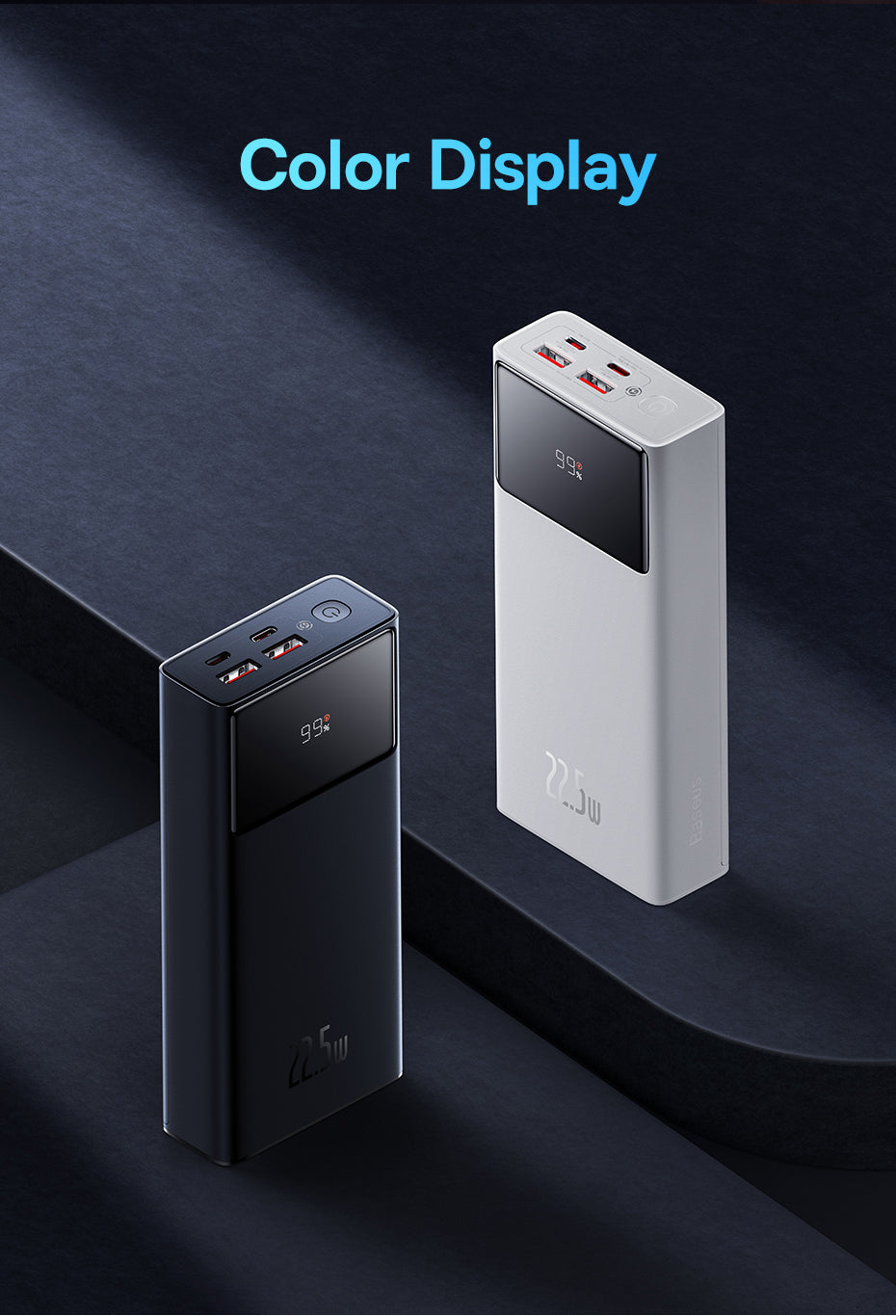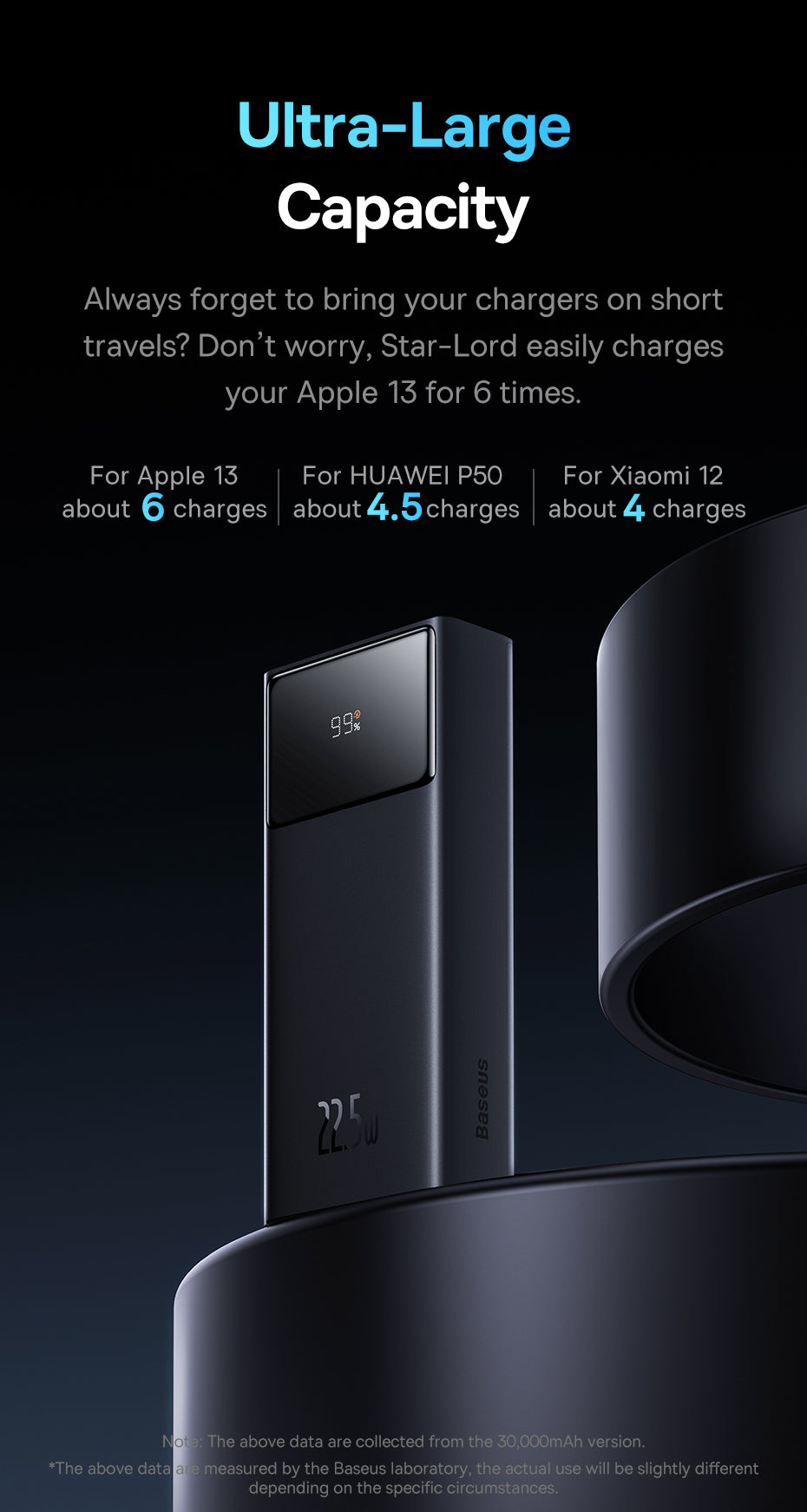Nabíjejte až 3 zařízení najednou pomocí powerbanky Baseus Star-Lord. S výkonem 22,5 W a kapacitou 20000 mAh poskytuje rychlé a bezpečné nabíjení na cestách. Podporuje rychlé nabíjení a inteligentní rozdělování energie (BPSII), které dynamicky rozděluje výkon mezi zařízení a upravuje napětí. Umožňuje nabíjet současně 3 zařízení a je kompatibilní s Huawei SCP/FCP, Apple PD, Xiaomi QC a Samsung AFC. Disponuje porty Micro (vstup), Type-C (vstup), Type-C (výstup) a USB USB1/USB2. Digitální LED displej zobrazuje zbývající kapacitu. Mezinárodní schválení pro leteckou přepravu. V balení: powerbanka a USB kabel. Rozměry 154,8 × 69,4 × 29,5 mm, hmotnost 450 g. Doba nabíjení samotné powerbanky je 6–7 hodin. PD 20W pro Apple 12/13 dosáhnete 50 % za 30 minut; pro iPhone 13 lze nabít čtyřikrát, což dle specifikací stačí na několik dní bez nabíjení.