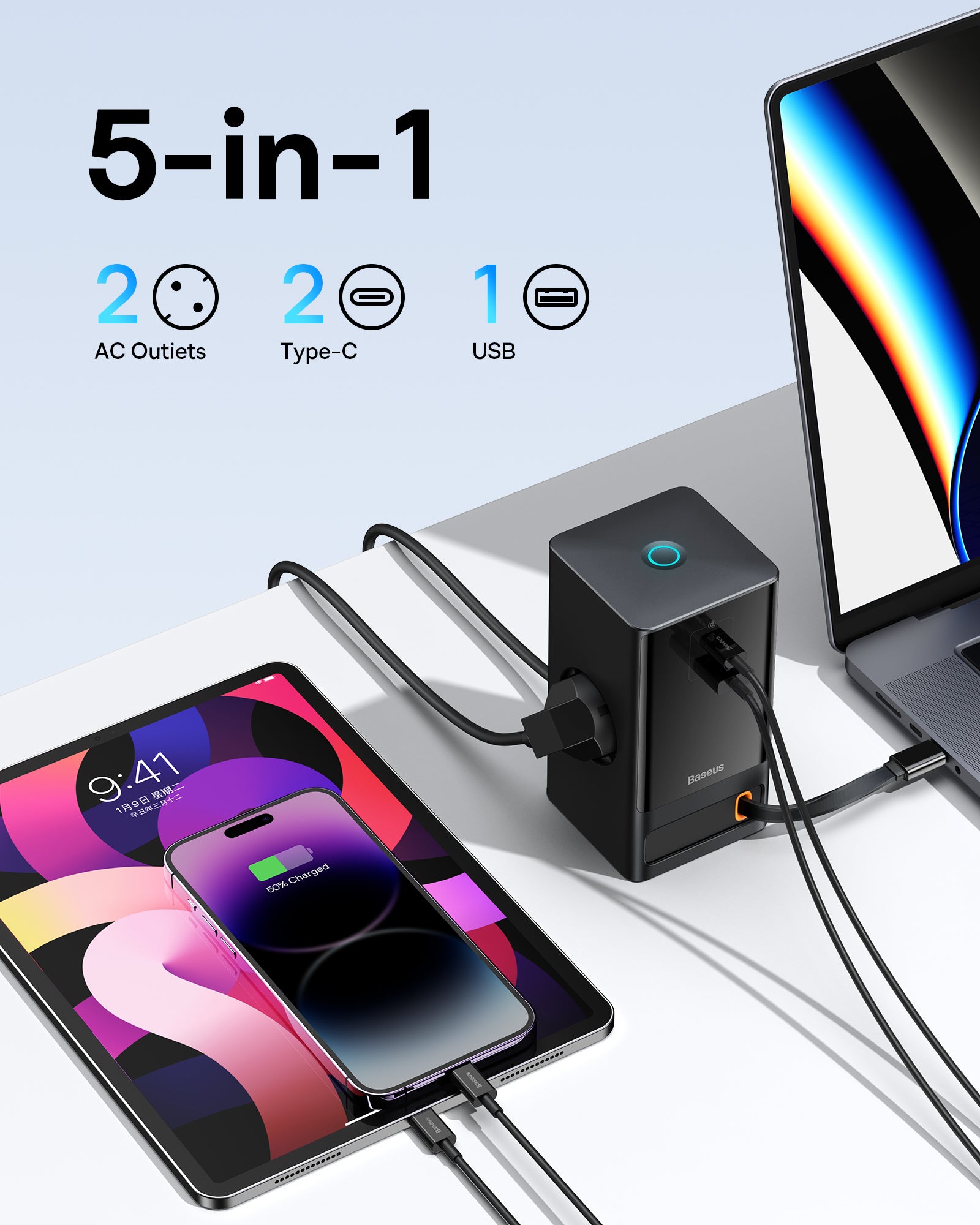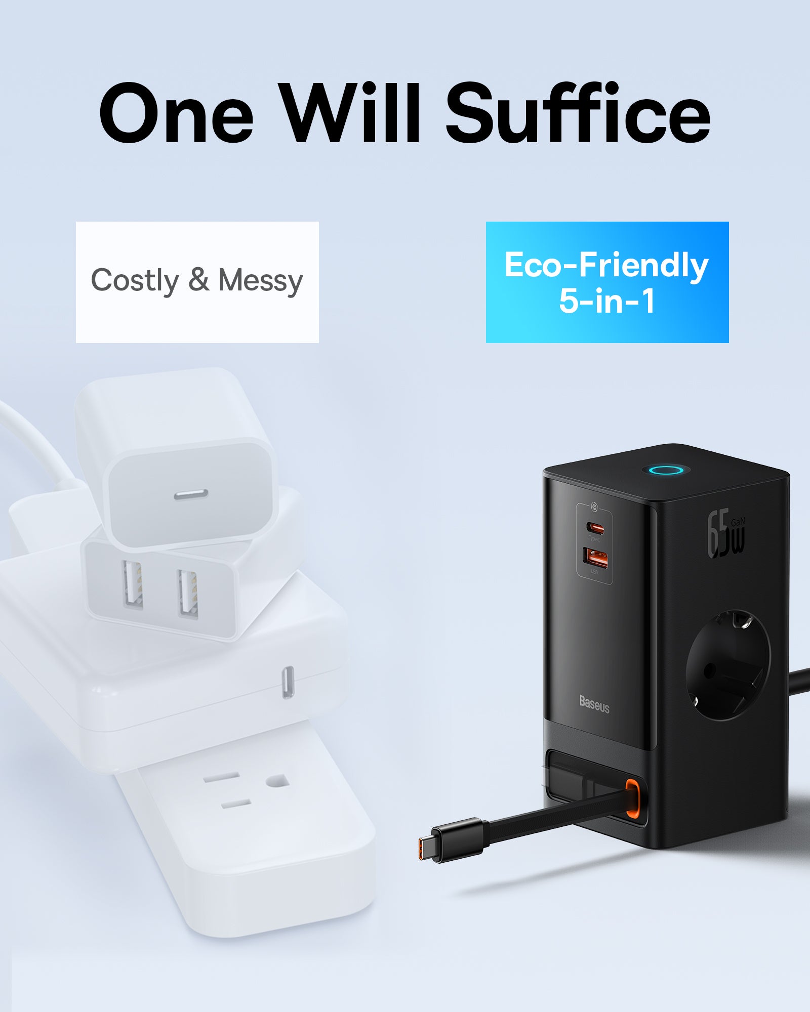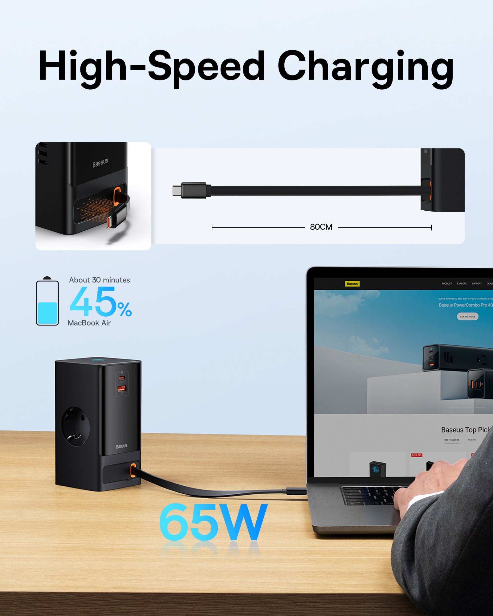 Nabíjecí stanice Baseus PowerCombo 65W 2xzásuvka,1xUSB,1xUSB-C,1xnavíjecí kabel USB-C černá