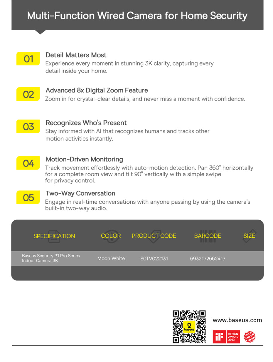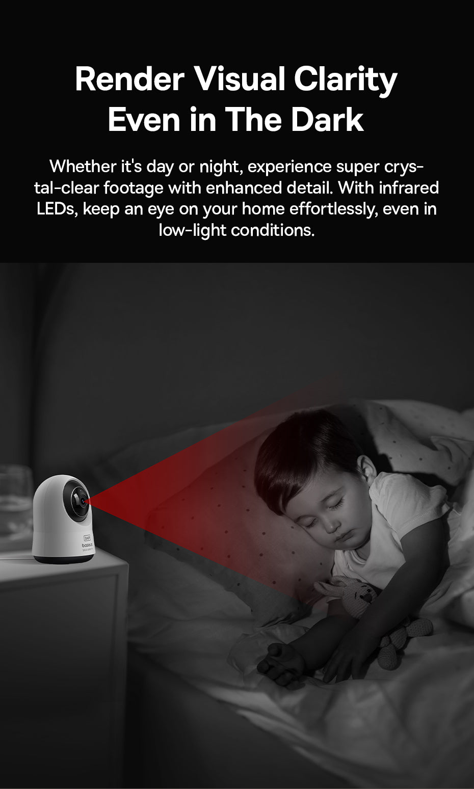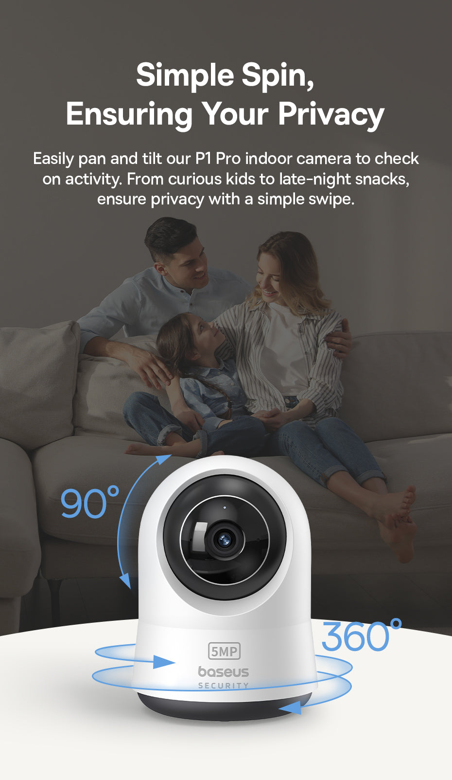 Baseus P1 Pro 3K je vnitřní kamera pro sledování s vysokou kvalitou obrazu a nejnovějšími funkcemi. Rozlišení 3K HD zajišťuje ostré detaily i při horším osvětlení díky infračerveným LED diodám.
