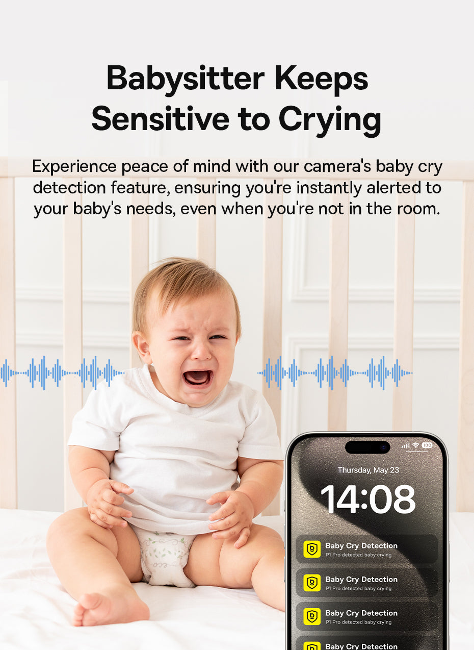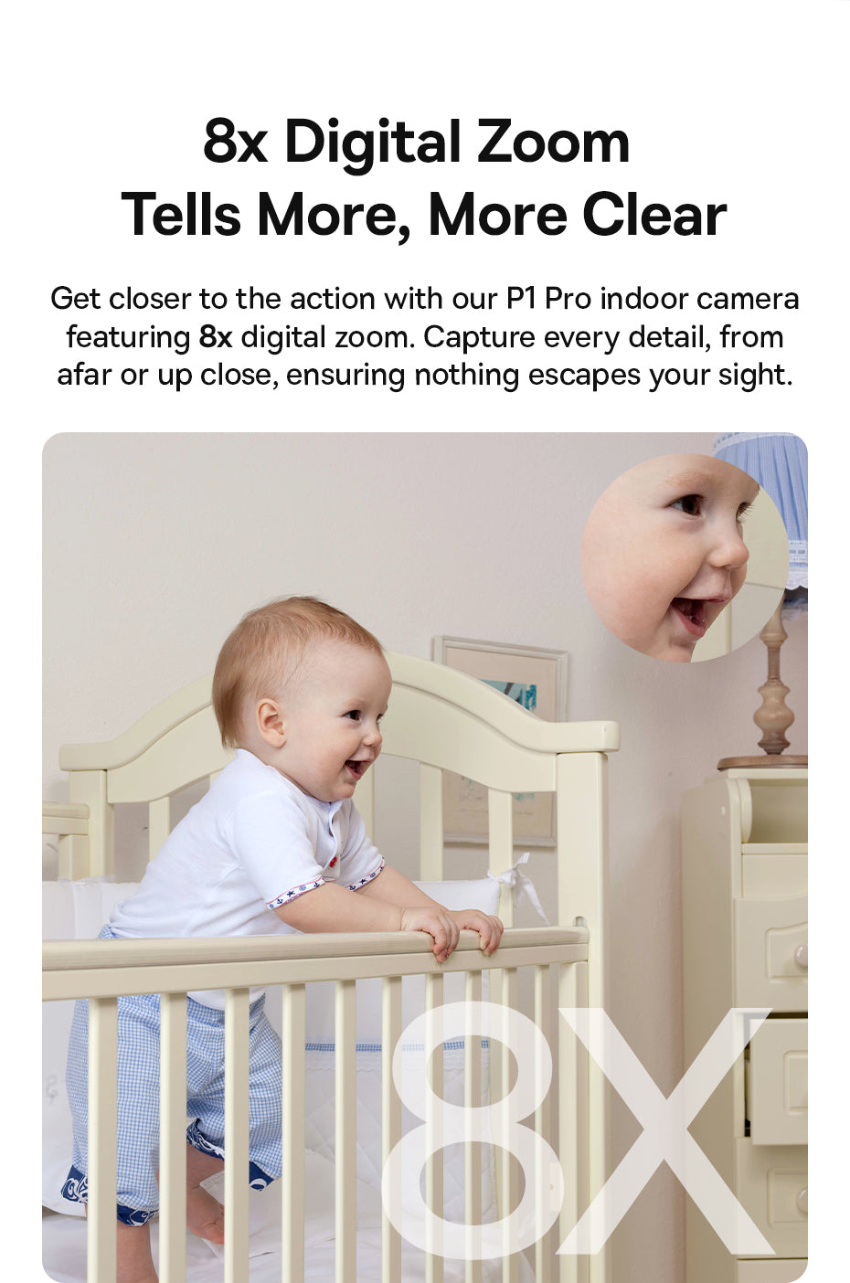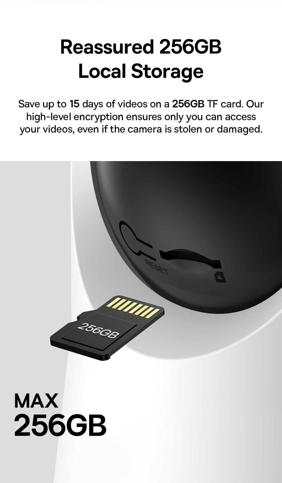 Mezi klíčové funkce patří 8x digitální zoom, chytré sledování pohybu a detekce AI osob s okamžitými upozorněními. Detekce dětského pláče pomáhá monitorovat potřeby dítěte, i když nejste poblíž. Záznam probíhá 24/7 s podporou microSD karet až do 256 GB; data jsou chráněna vysokým šifrováním WPA2 a stabilním Wi-Fi 2,4/5 GHz.