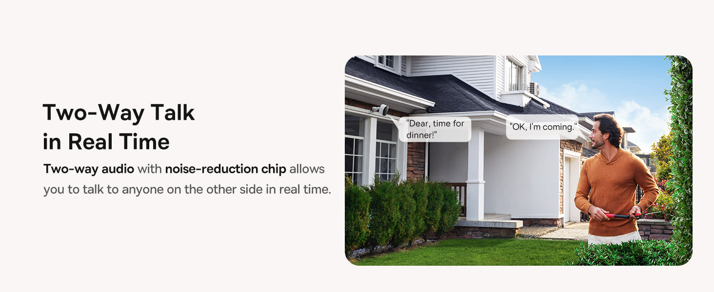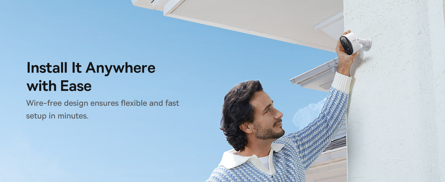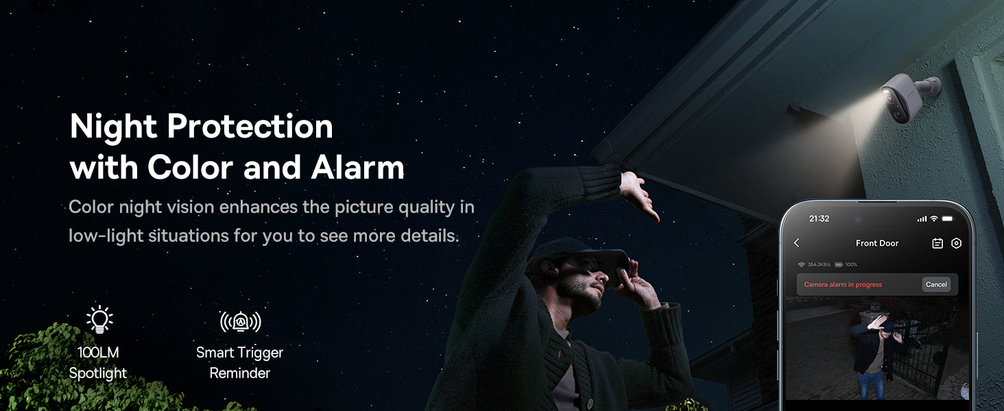 Venkovní bezpečnostní kamera s rozlišením 2K (2304x1296) pro ostrý obraz a široký záběr 145°. Objektiv se světelností F2,0 snižuje mrtvé úhly a 8× digitální zoom umožňuje detailní záběry. Barevné i infračervené noční vidění je doplněno 100 lumenovým LED reflektorem pro jasný obraz ve tmě. AI detekce pohybu s PIR senzory spolehlivá upozornění a obousměrný zvuk s potlačením šumu vytváří komunikaci na dálku. Lokální úložiště 16 GB eMMC lze rozšířit až na 16 TB bez předplatného. Data jsou chráněna šifrováním AES-128 a RSA. Připojení přes WLAN 2,4 GHz; kompatibilita s Google Home a Amazon Alexa. Přizpůsobitelné monitorování s aktivitou a zónami. Baterie 9600 mAh umožňuje až 270 dní provozu. Certifikace TÜV Rheinland EN303645 a CCPA. IP67 a provozní teplota -20 °C až +50 °C.