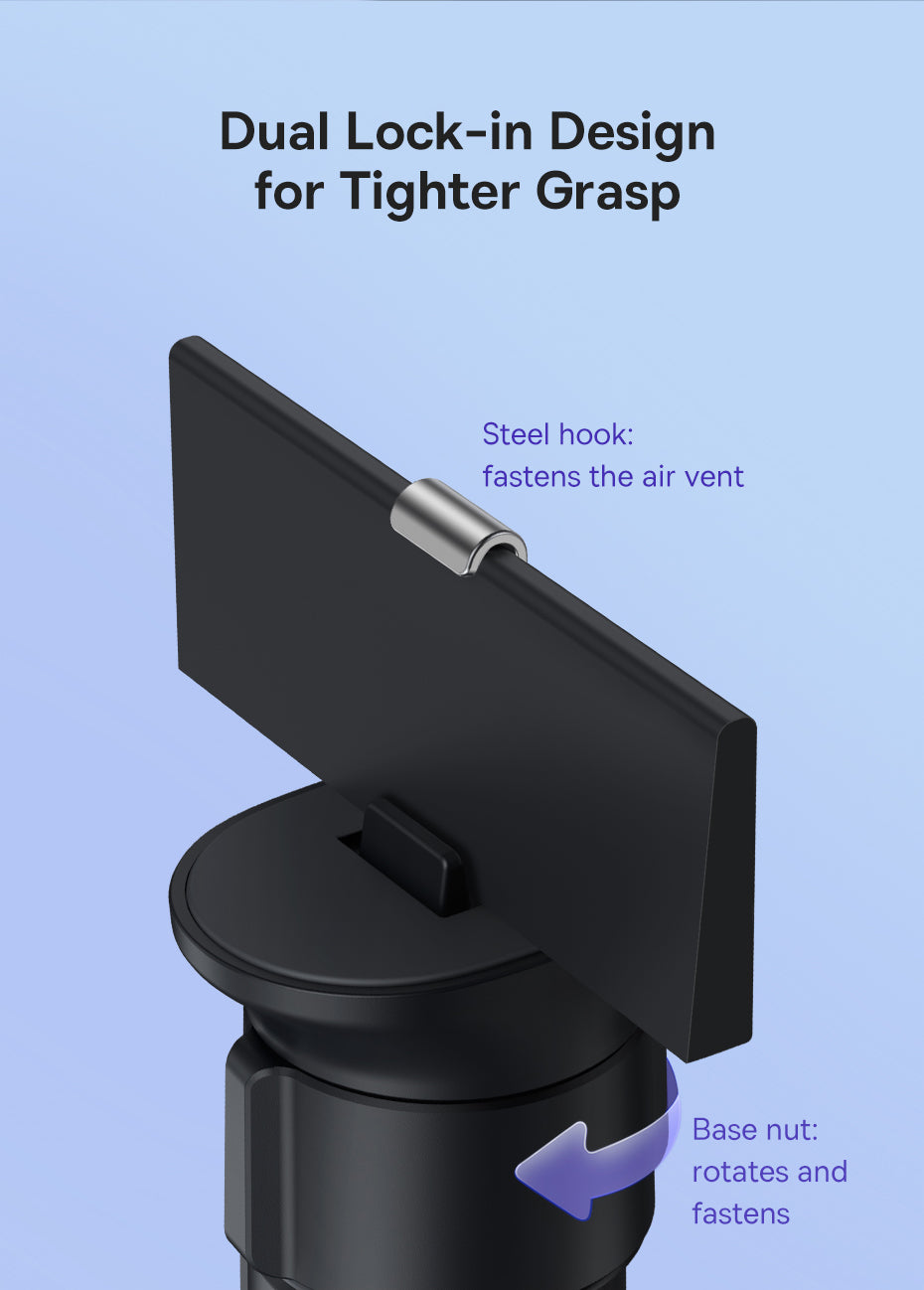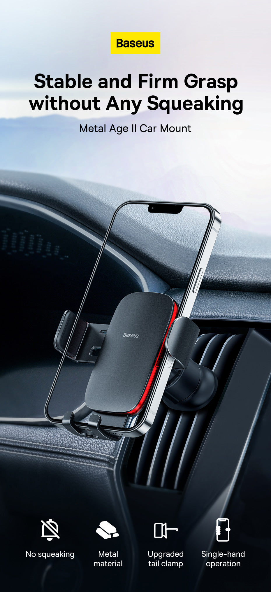Metal Age II Gravitační držák pro smartphone je spolehlivé řešení pro upevnění telefonu během jízdy. Rukojeť je kovová s matným povrchem, odolný vůči namáhání a změnám teplot. Držák je určen pro telefony s úhlopříčkou 4,7–6,7 palce a pojme zařízení nad 250 g díky gravitačnímu mechanismu a trojitému rozestupu ramen. Silikonové podložky na rameno chrání zařízení před poškrábáním. Montáž probíhá na ventilační mřížku pomocí svorky nové generace; výřez pro nabíjecí port umožňuje nabíjení i během jízdy. Kovová povrchová úprava z hliníku a ABS zajišťuje odolnost a pevnost; rozměry 110 × 88 mm, hmotnost 80 g. Výhody zahrnují jednou rukou ovladatelné uchycení, stabilní trojramenný mechanismus a širokou kompatibilitu, aniž by narušoval výhled ani poškozoval mřížku.