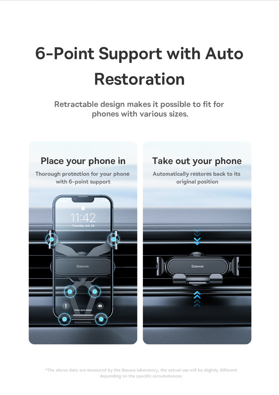 Držák Baseus umožňuje ovládat jednou rukou díky gravitačnímu mechanismu. Stačí položit telefon na panel a čelisti se automaticky utáhnou, čímž zajistí pevné uchycení.