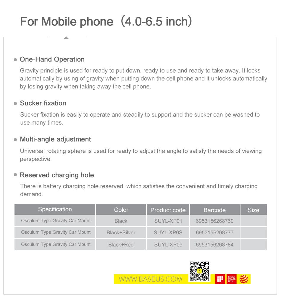 Držák Osculum pro auto je určen pro montáž na palubní desku (rovný povrch). Využívá gravitační technologii, která se automaticky utáhne podle váhy vloženého zařízení. Trojúhelníková konstrukce zajišťuje plnou telefonu a širokou ramena stabilitu poskytují jistotu i na náročných cestách. Dvoustupňová přísavka umožňuje zvýšit přilnavost a použití na různé typy povrchů. Materiál: plast, TPE, ABS. Hmotnost držáku: 120g. Upevnění: přísavka na palubní desku; k dispozici vyhrazený otvor pro kabel nabíječky. Kompatibilita: zařízení o šířce 55–90 mm. Snadné ovládání jednou rukou, gravitační mechanismus tlačítka. Před změnou místa montáže stačí přísavku opláchnout vodou a nechat uschnout. Poznámky: držák je vhodný pouze pro montáž na palubní desku; na čelní sklo nepřipevňujte, vystavování slunečnímu záření může poškodit gelovou přísavku; silná přísavka může deformovat měkké desky.