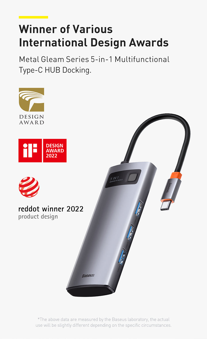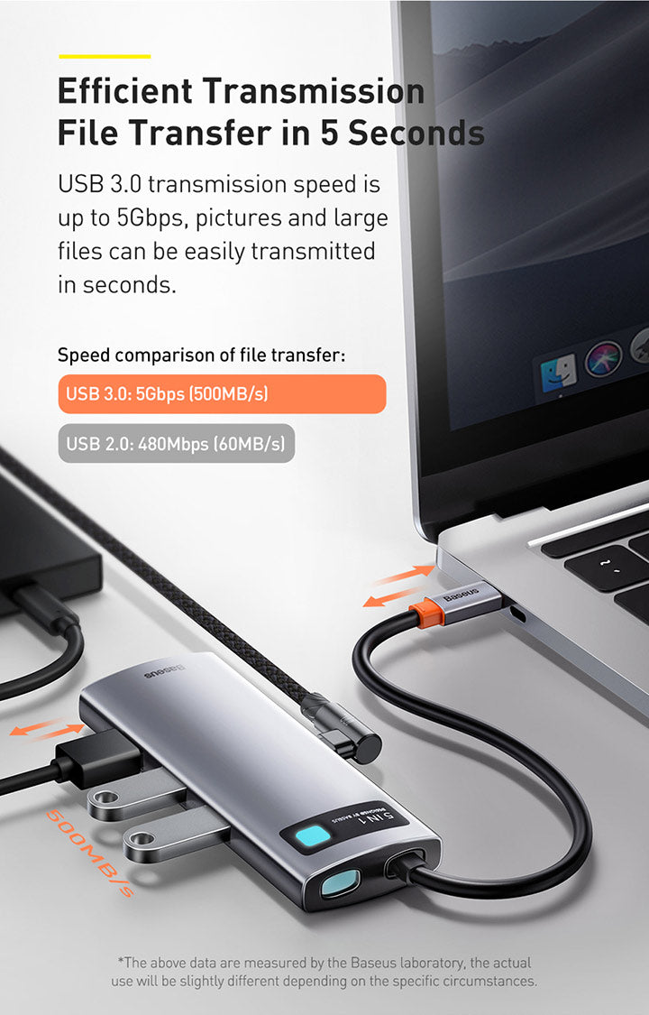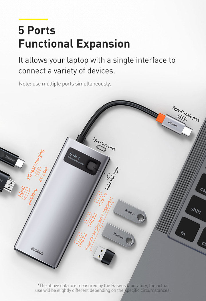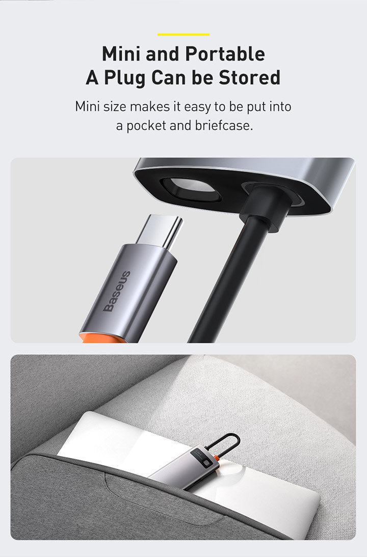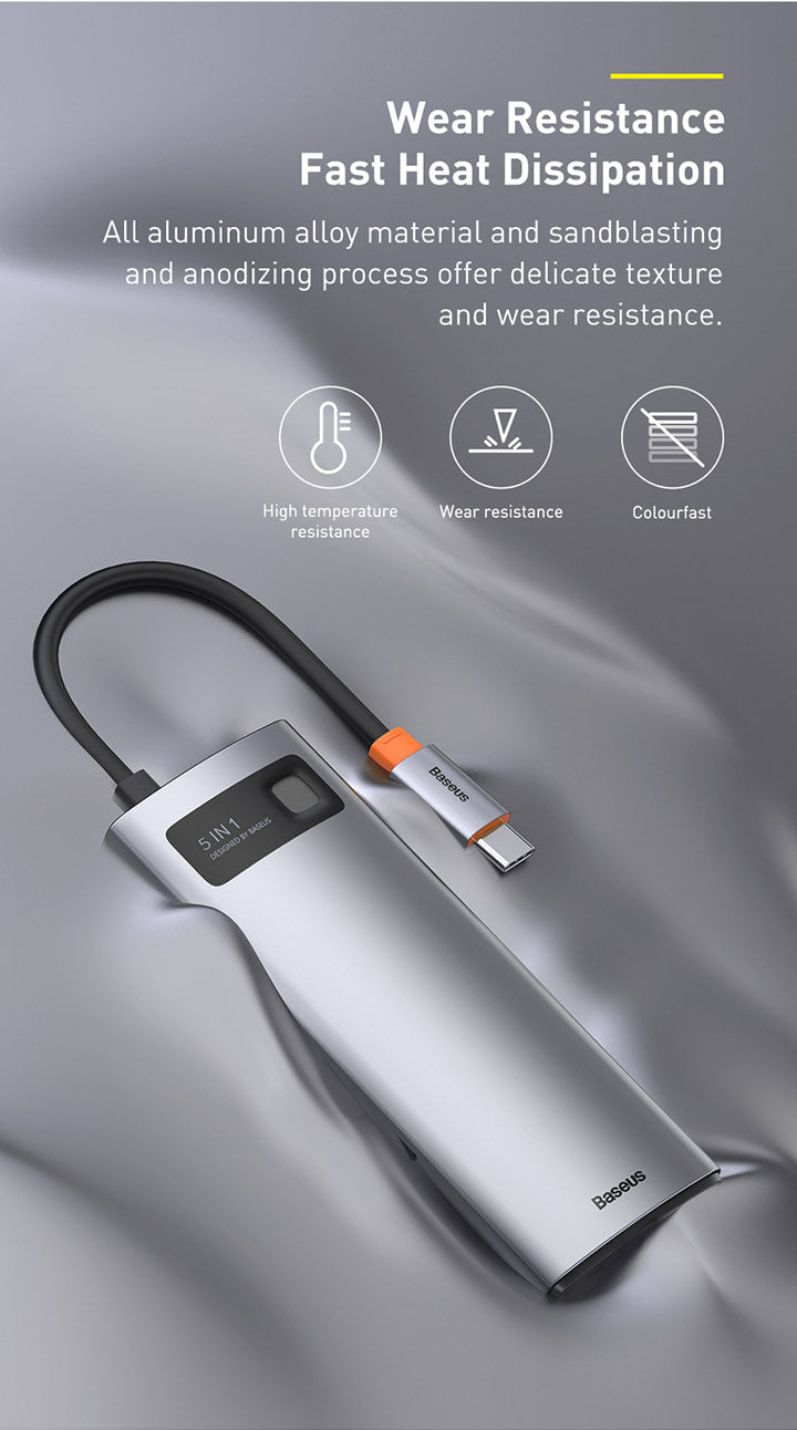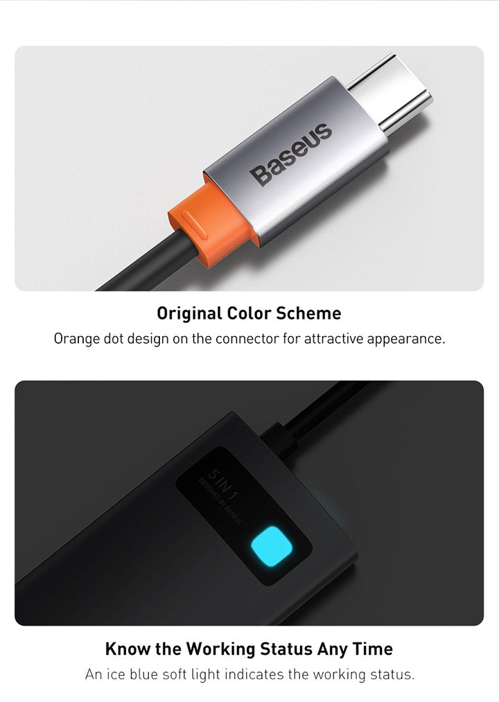 Baseus Metal Gleam je praktický náboj, který výrazně rozšíří portovou připravenost notebooku. Připojuje se prostřednictvím USB‑C a nabízí 5 portů: 3× USB 3.0, 1× USB‑C s podporou Power Delivery a 1× HDMI výstup pro propojení s projektorem nebo externím monitorem. Díky modernímu rozhraní USB‑C je vhodný pro většinu současných notebooků a umožňuje současné napájení a připojení periferií. Kompaktní a snadno přenosný, ideální na cestách i na pracovním stole pro prezentaci, videohovory a rozšíření pracovního prostoru.