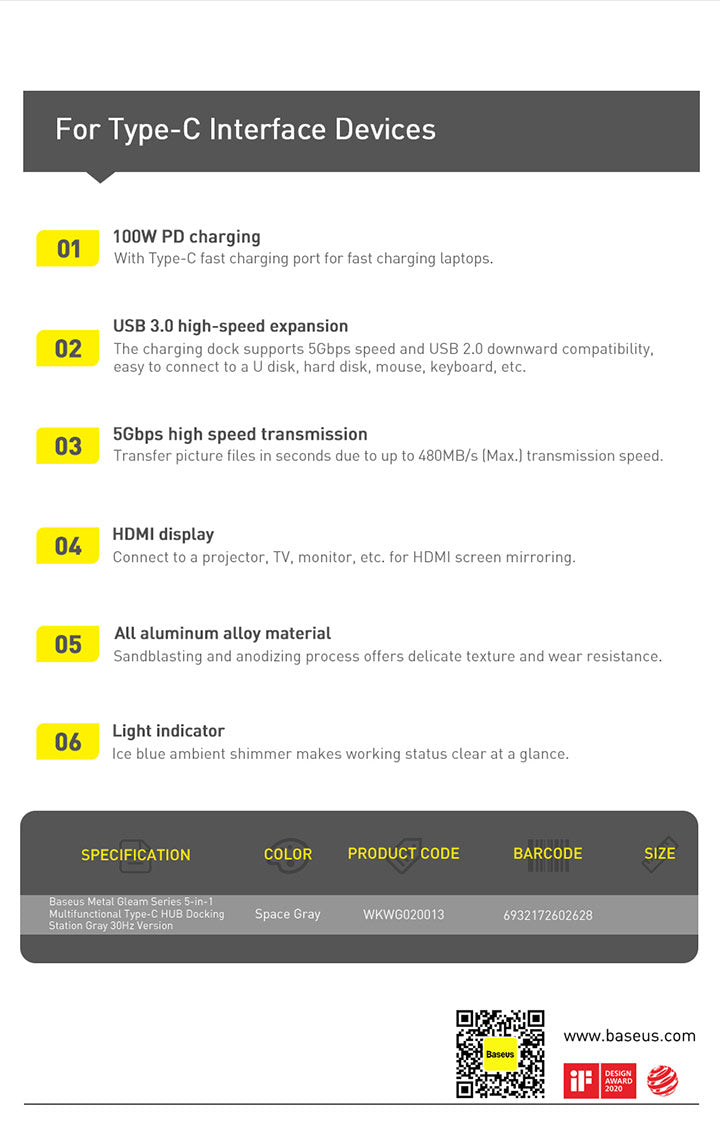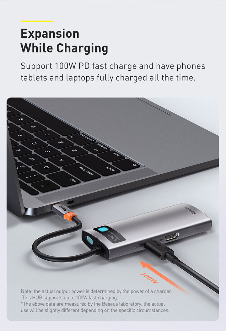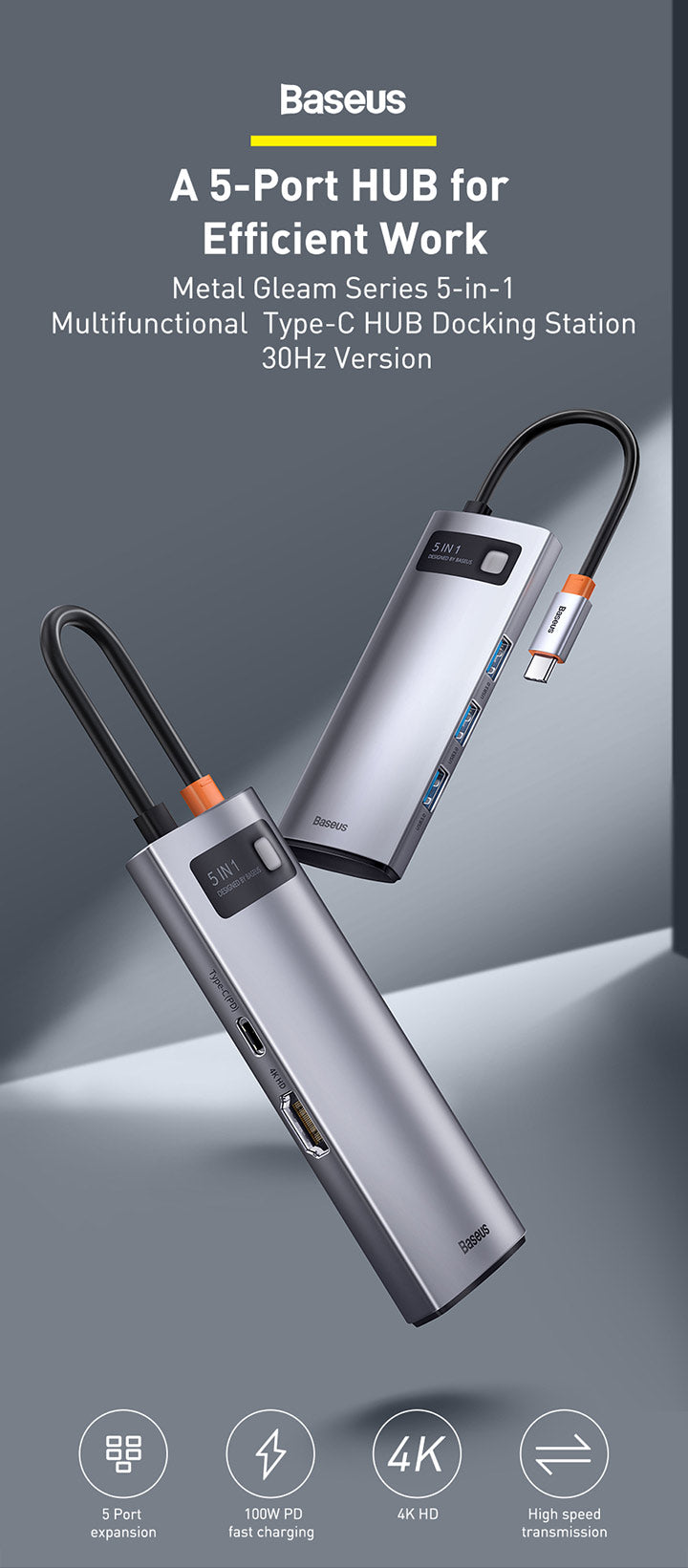 Dokovací stanice 5v1 Baseus Metal Gleam 100W 1xUSB-C, 3xUSB, 1xHDMI šedá